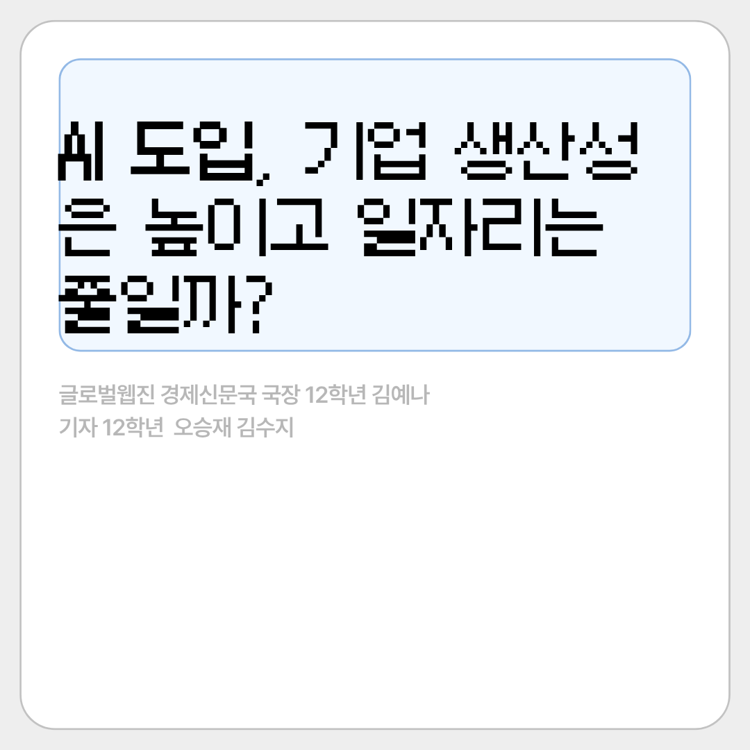 | | |  | | AI도입, 기업 생산성은 .. AI는 기업 생산성을 크게 높이지만 일부 일자리를 줄일 수 있으며, 핵심은 변화에 적응하기 위한 재교육과.. |